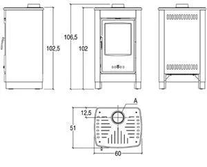 CARATTERISTICHE TECNICHE: Potenza termica del focolare kW: 10,4 Dimensioni (LxPxH) cm: 60x51x102 Rivestimento: acciaio verniciato Piano: ghisa Interno monoblocco: acciaio Aria primaria e secondaria: regolabile Focolare e deflettore: ghisa Piano fuoco: ghisa Riscaldamento: convezione naturale e irraggiamento Scarico fumi cm ø: 15 Cassetto cenere: estraibile Porta: ghisa con chiusura automatica Vetro ceramico: resistente a 750° C autopulente Maniglia: acciaio finitura nichelata